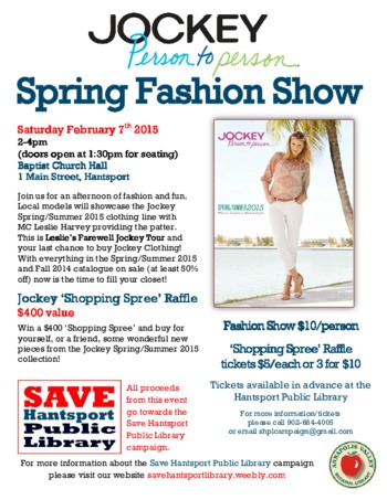 The Jockey ‘Person to Person’ spring 2015 will showcase local model dress collections with MC Leslie Harvey providing the patter. It’s a last chance to buy Jockey Clothing! With everything in the Spring/Summer 2015 and fall 2014 catalogue on sale (at least 50% off) and also $400 Shopping Spree Raffle to be drawn.