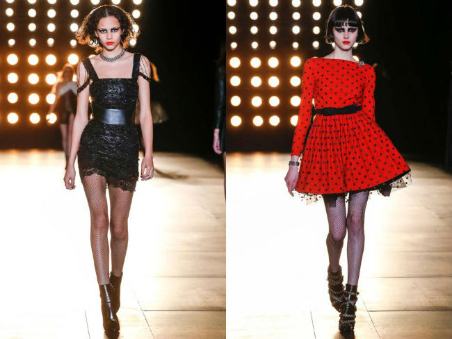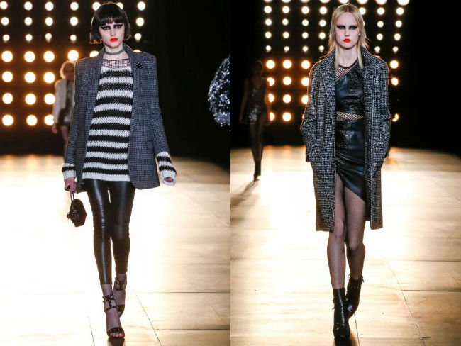 Saint Laurent shows the different dress collection, in an arena stage , beautiful models wearing a variety of dresses like mini crinis, cigarette pants with suspenders and also one-sleeve cocktail dress or a strapless style crisscrossed with zippers.